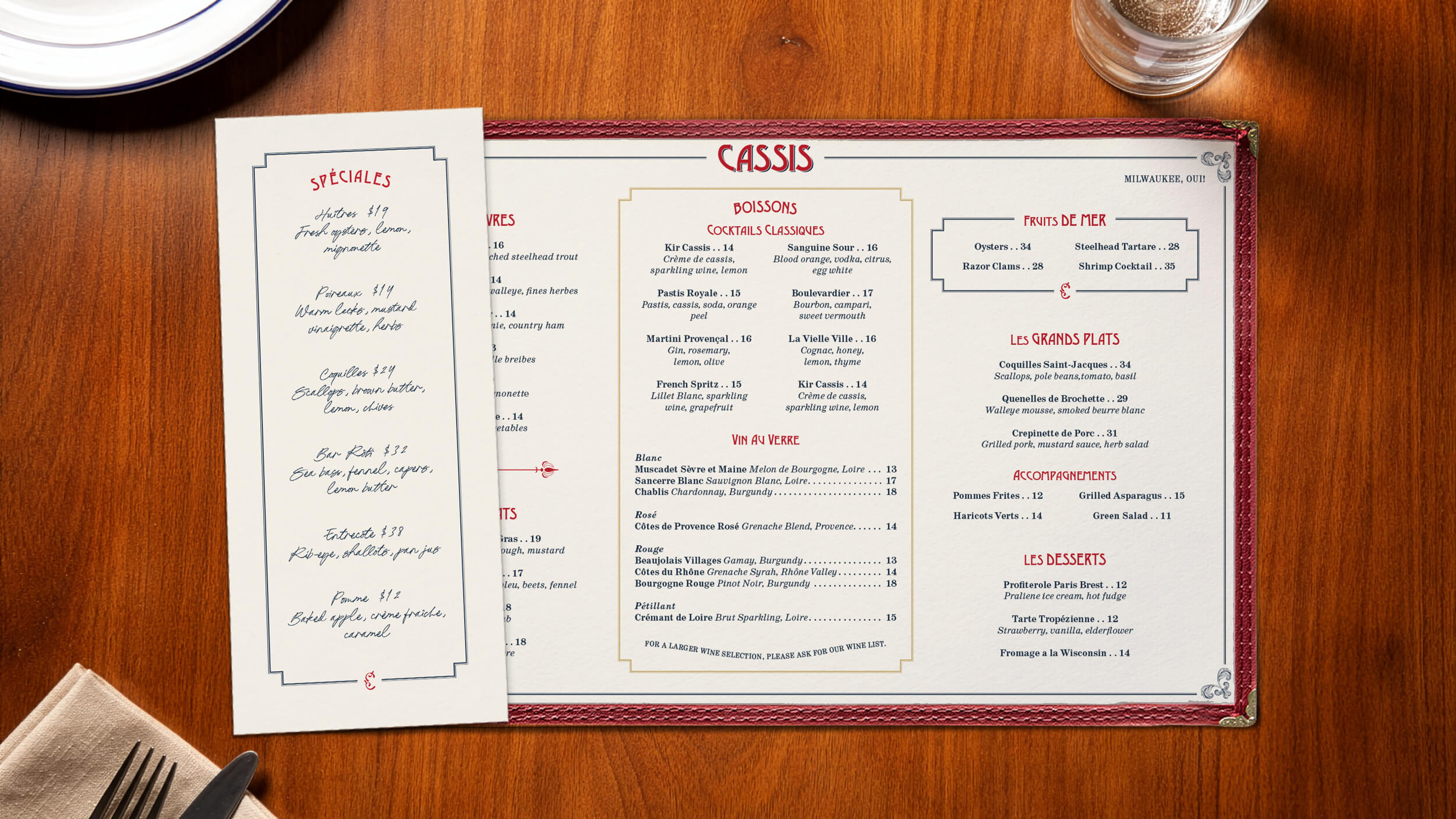 Cassis opened in a new development, but the brand needed the weight of a long-standing brasserie. We built the identity from classic bistro references and the restaurant’s French point of view, tuned for a Midwestern dining audience. The result is a durable system for an all-day, high-volume room, carried consistently across menus and collateral.